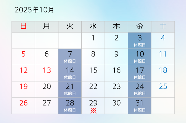 2025年10月の営業日 2025.09.14 2025年10月の営業日は以下の通りです。 平日 10:00~17:00(最終入館16:00) 土日祝 10:00~18:00(最終入館17:00) 10/29(水)※のみ、ビル防災訓練のため12:30開館です。 みなさまのご来館を心よりお待ちしております。