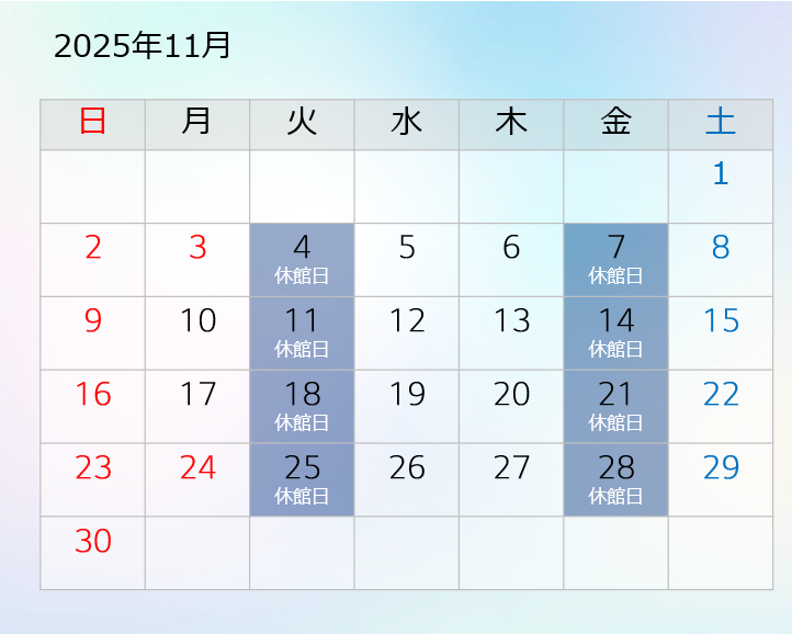 2025年11月の営業日 2025.10.16 2025年11月の営業日は以下の通りです。 平日 10:00~17:00(最終入館16:00) 土日祝 10:00~18:00(最終入館17:00) みなさまのご来館を心よりお待ちしております。