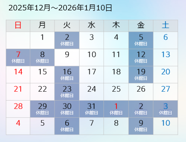 2025年12月・年末年始の休館日 2025.11.06 12/7(日)、12/8(月)は臨時休館、12/9(火)は振替営業いたします。 尚、年末年始の休館日は12/29(月)~1/3(土)です。 平日 10:00~17:00 (最終入館 16:00) 土日祝 10:00~18:00 (最終入館 17:00) みなさまのご来館を心よりお待ちしております。