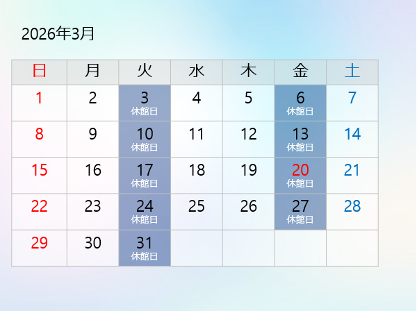 2026年3月の営業日 2026.02.05 2026年3月の営業日は以下の通りです。 平日 10:00~17:00(最終入館16:00) 土日祝 10:00~18:00(最終入館17:00) みなさまのご来館を心よりお待ちしております。